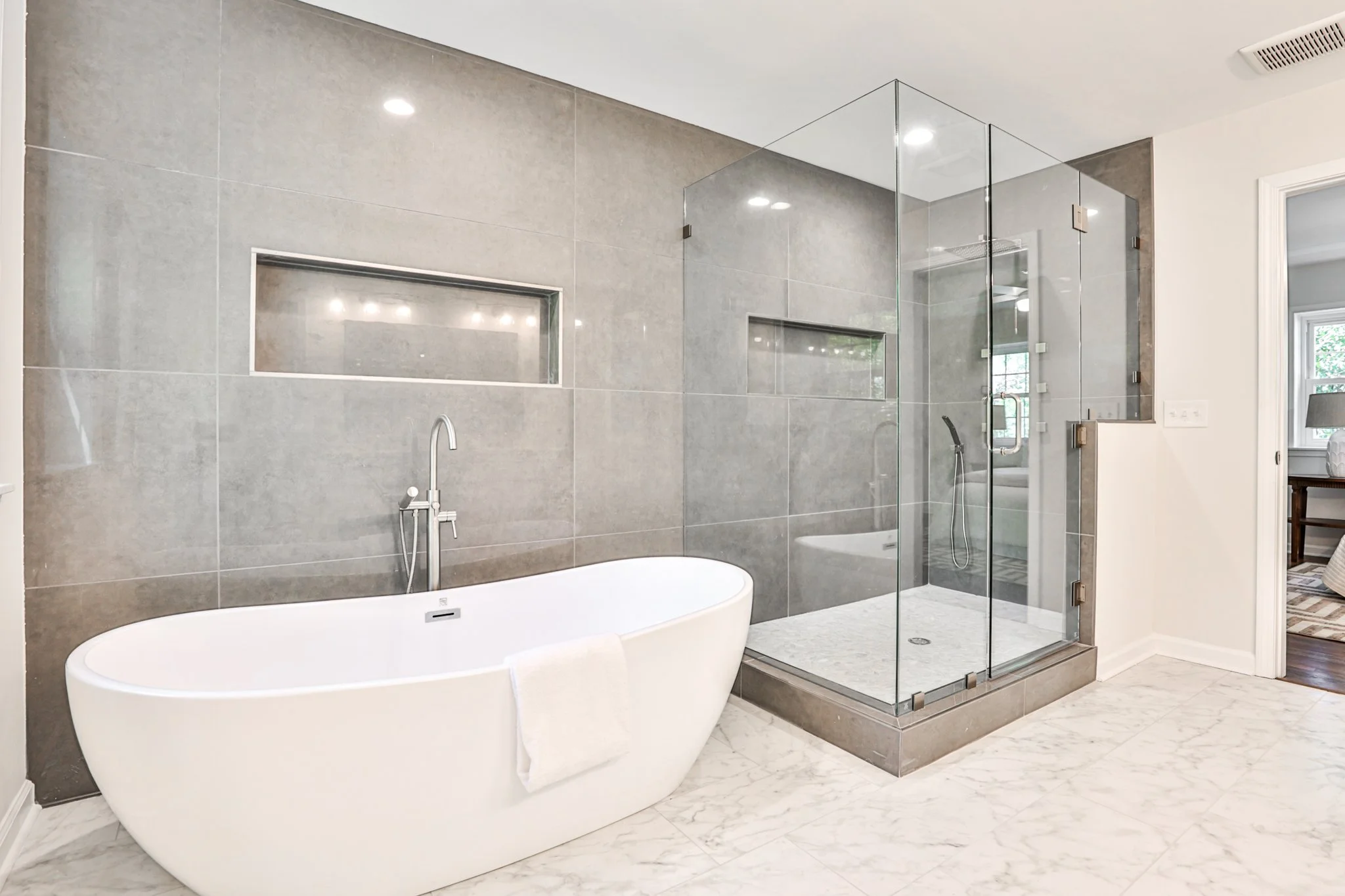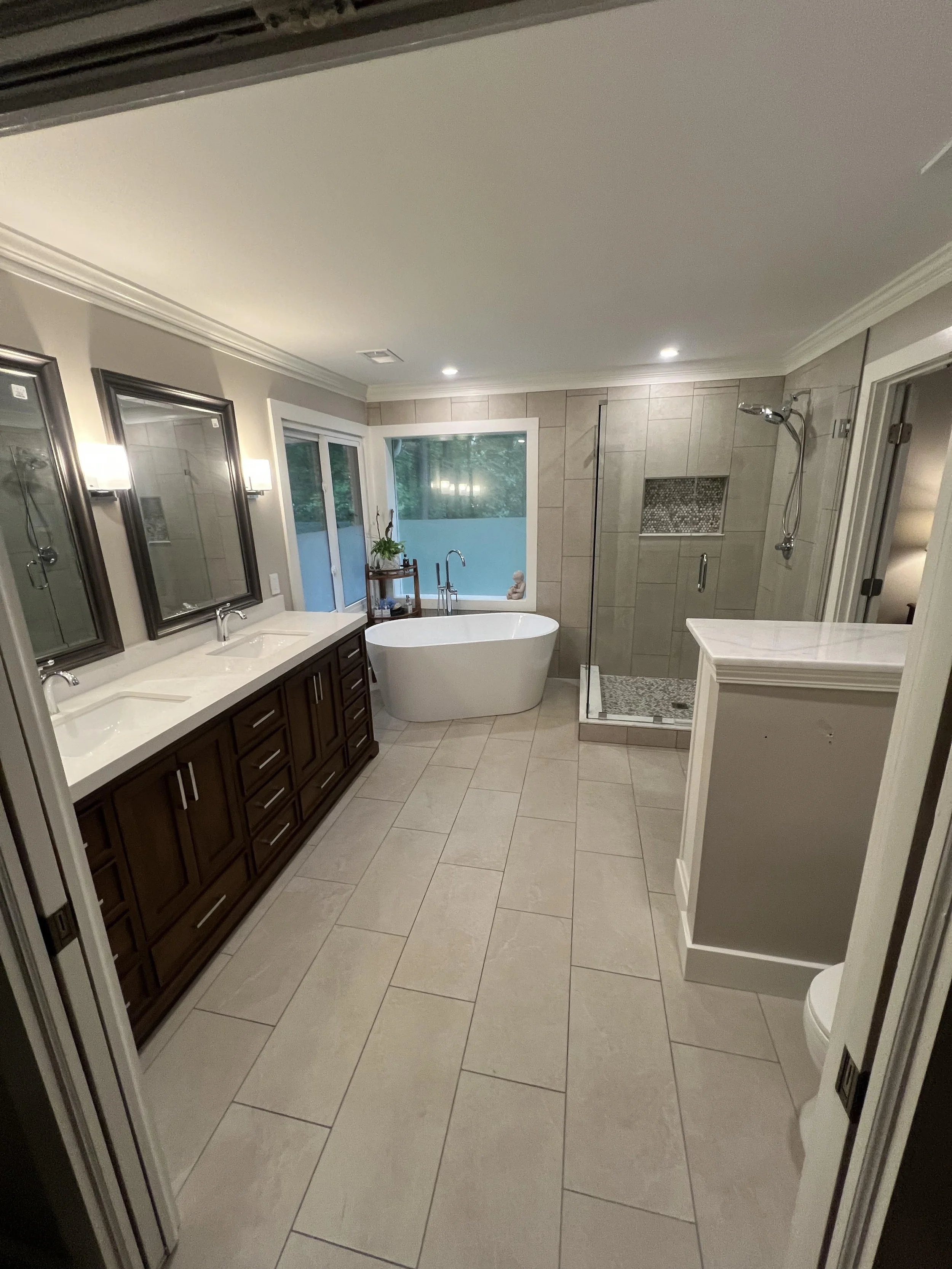 This primary bathroom remodel includes luxury, spa like elements such as an oversized tub, tiled feature wall, and lavish shower faucet with 8 body jets.